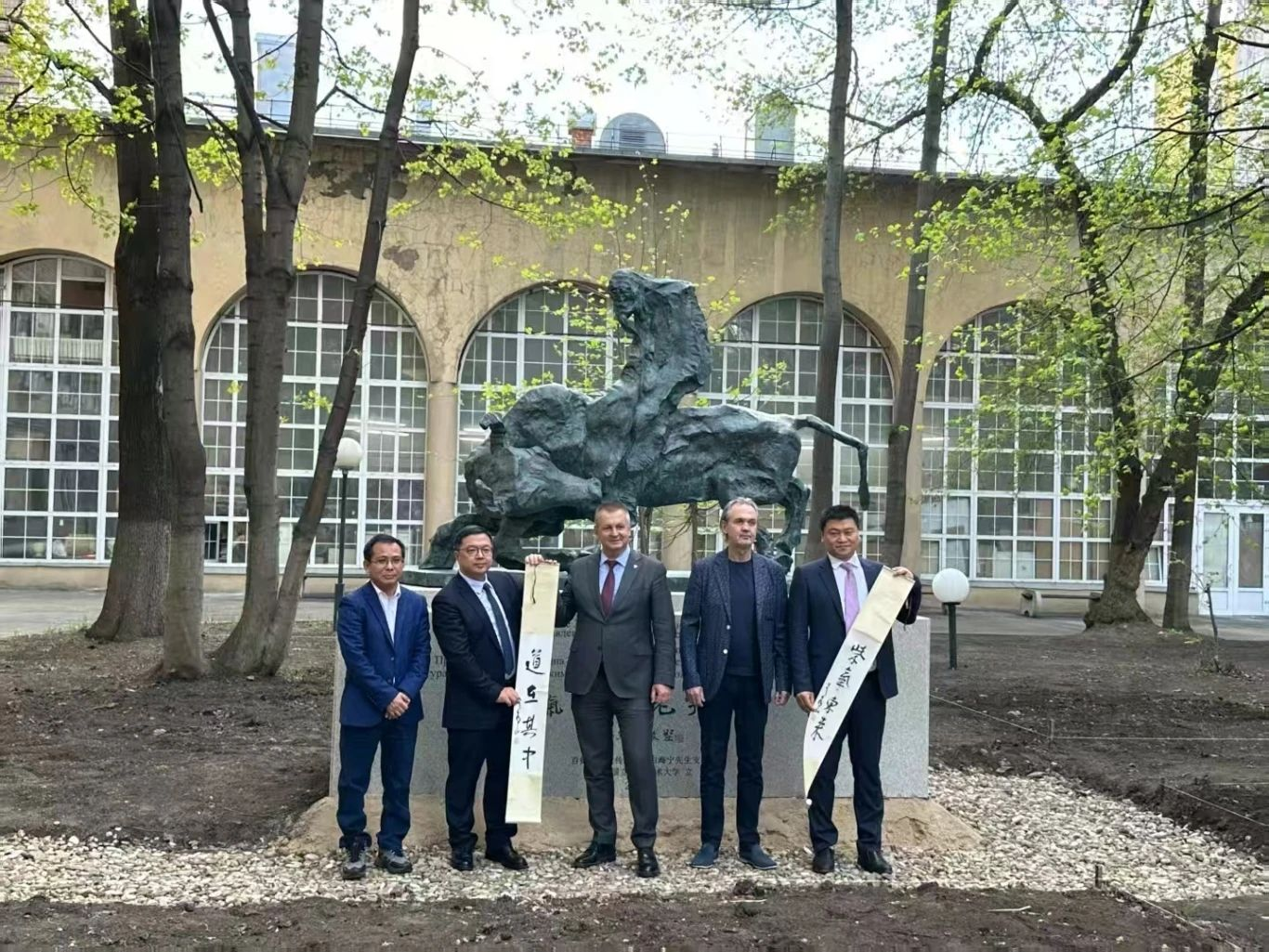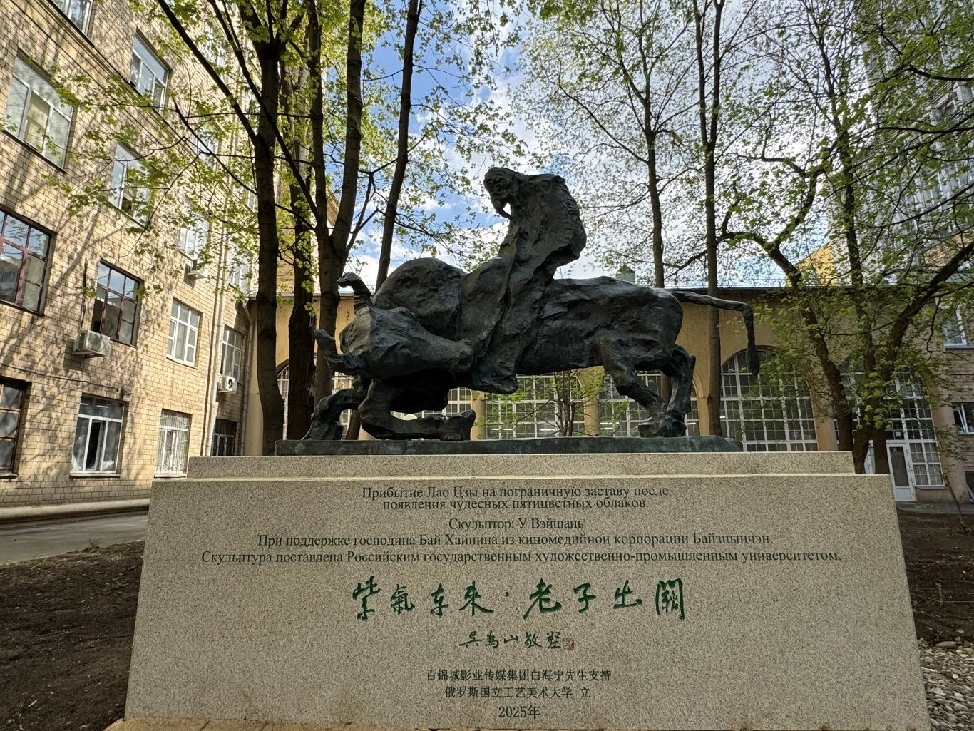2025年4月22日正午时分,阳光轻洒在俄罗斯国立工艺美术大学的校园,国际知名雕塑家、中国美术馆馆长、南京大学吴为山教授的力作《紫气东来•老子出关》在此正式落成。雕塑中,“老子”身姿飘逸,宛如仙人骑青牛悠然前行,在葱郁树木的掩映下,尽显高古奇崛之态。青铜与石材巧妙融合,在万物复苏、生机盎然的校园里,宛如一位静谧的智者,无声地传递着东方美学的深邃意蕴与写意精神的灵动韵味。