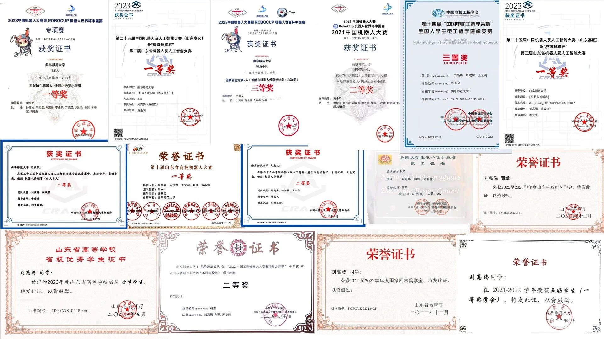 在校期间获中国机器人大赛暨 RoboCup 机器人世界杯中国赛四足仿生机器人赛项二等奖、第二十五届中国机器人及人工智能大赛机器人创新赛项二等奖、第二十五届中国机器人及人工智能大赛机器人舞蹈赛项二等奖、2023全国大学生电子设计大赛省二等奖、 2022中国工程机器人大赛暨国际公开赛二等奖 、2023中国机器人大赛暨 RoboCup 机器人世界杯中国赛创新创意赛项三等奖、第十四届“中国电机工程学会杯”全国大学生电工数学建模竞赛三等奖。主持省级大学生创新训练计划项目一项、参与省级大学生创新训练项目一项。以第一作者发表科技核心论文一篇。在校期间荣获国家励志奖学金、省政府奖学金、校级一等奖学金;省优秀学生、校级五好学生等荣誉称号。