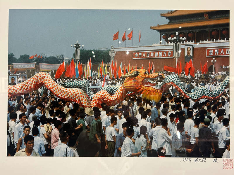 翁乃强摄影作品《粉碎“四人帮”后天安门广场的舞龙表演》。中青报·中青网记者 李桂杰/摄