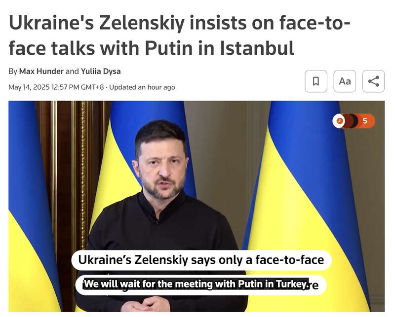 乌克兰总统顾问波多利亚克对路透社表示:“泽连斯基总统在伊斯坦布尔不会与除普京之外的任何俄罗斯代表会面。”