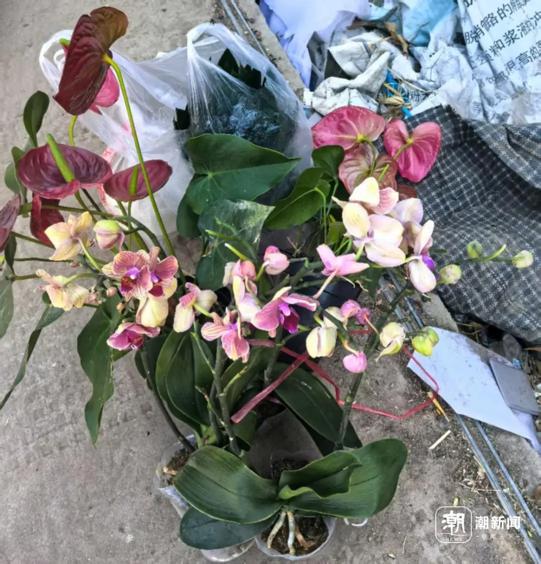 记者也试着在“垃圾山”边缘翻找了几分钟,找出了两盆红掌和4盆有点蔫了的蝴蝶兰。