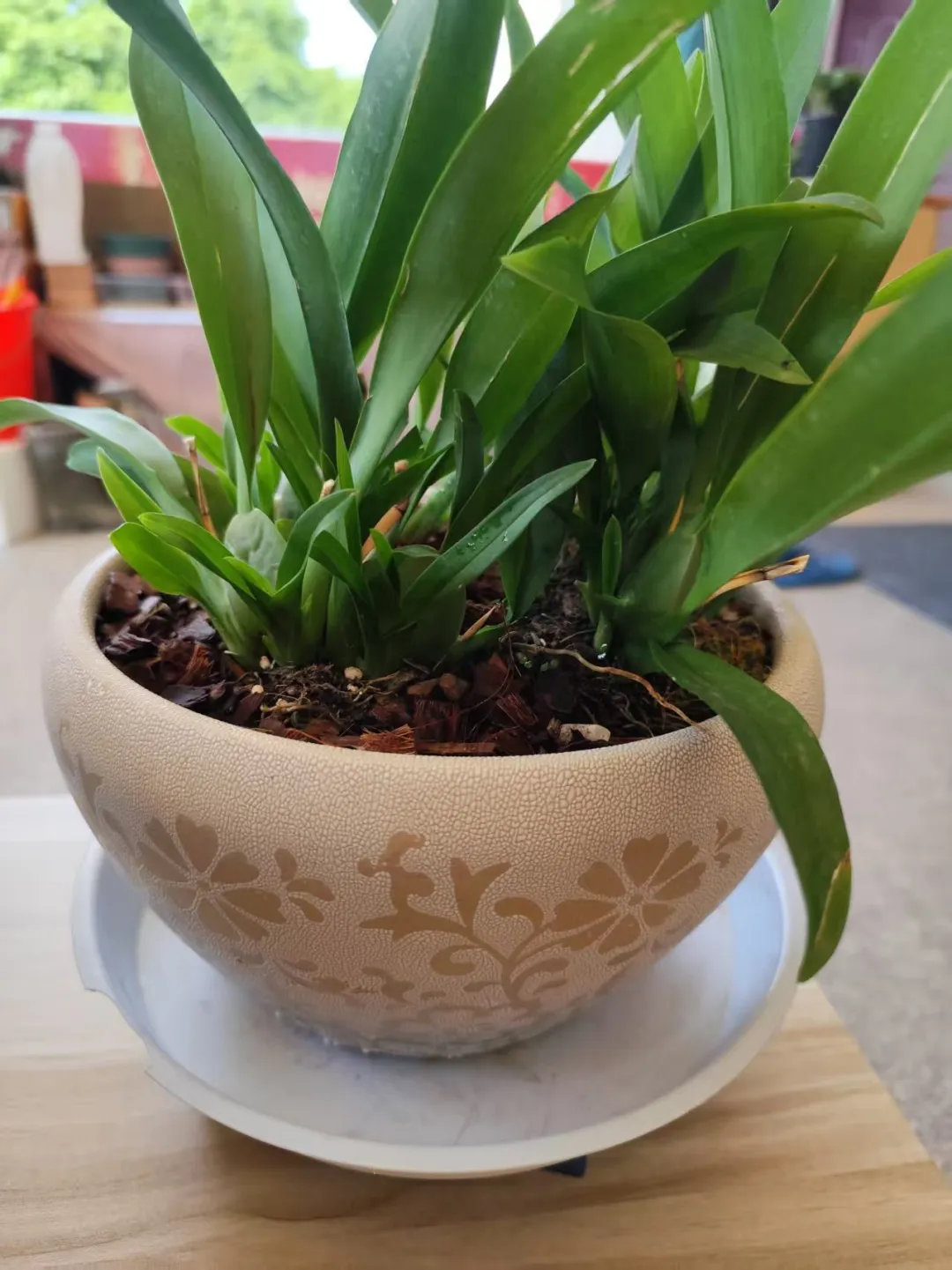 第一次来时捡到的4盆小文心兰,大姐把它们拼到了一个花盆里,现在已经长出了新叶。“花是免费捡来的,但是之后的投入其实并不小,养兰花需要专门的花土,购买花土花了十几块,又给花换了一个好看的盆子,但乐趣就在这里。”