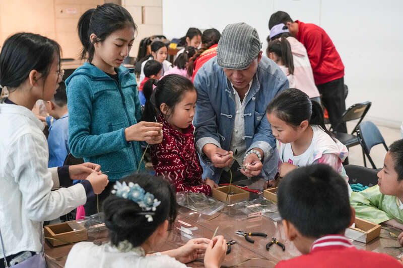 稍后,一群孩子围着中国非遗馆5楼的几张桌子,绞尽脑汁地缠绕手上的草条。当天是立夏前一天,该馆除了常设体验项目,还举办“应时循节学非遗:‘二十四节气’研学”活动。其中一个环节,由宣化柳沟草编技艺代表性传承人韩建国教孩子们制作一款“立夏手作”:草编蜻蜓冰箱贴。
