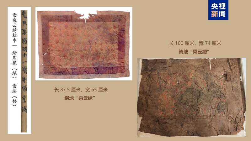 1972年考古发掘的长沙马王堆一号墓,即西汉初期长沙国丞相、第一代轪侯之妻辛追的墓葬中,出土了大量丝织品。1973年完成的长沙马王堆一号汉墓考古报告显示,一号墓北边厢出土了2件“枕巾”,一件为绢地“乘云绣”,一件为绮地“乘云绣”。