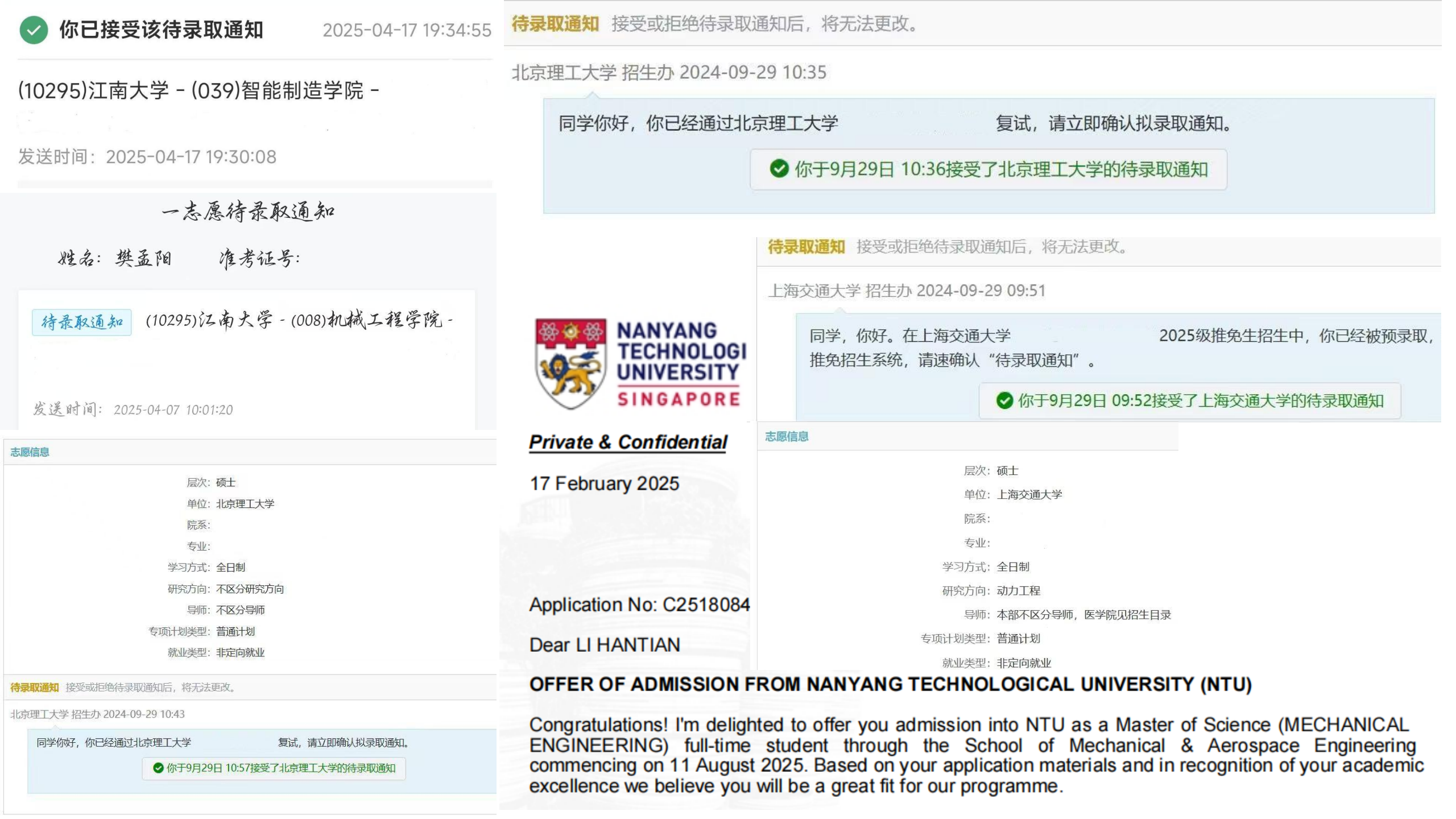 如今,六个齿轮即将在新的坐标系运转:上海交大的航空发动机、北理工的智能装备、南洋理工的机械工程、江南大学的机械工程......而那些6:30的闹钟、深夜微亮的台灯、写满公式的纸张,终将沉淀为机械工程学院最硬核的青春印记——六人同行,比单打独斗走得更远。