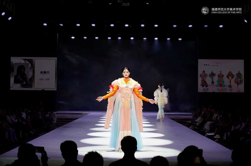 研究生罗慈悦的作品《大隐于市—木之魂 ·雕之意》以莆田木雕为灵感来源,以非遗活化为导向,创新工艺技法、图案纹样及色彩体系,探索传统雕刻工艺向现代服装设计的创新表达。本科生周宣霞的作品“新狮代”以舞狮为设计灵感,从舞狮中提取造型与色彩的形式美感,用精致的立体绕线工艺,设计与制作出兼具古典韵味和时尚潮流的现代时装。