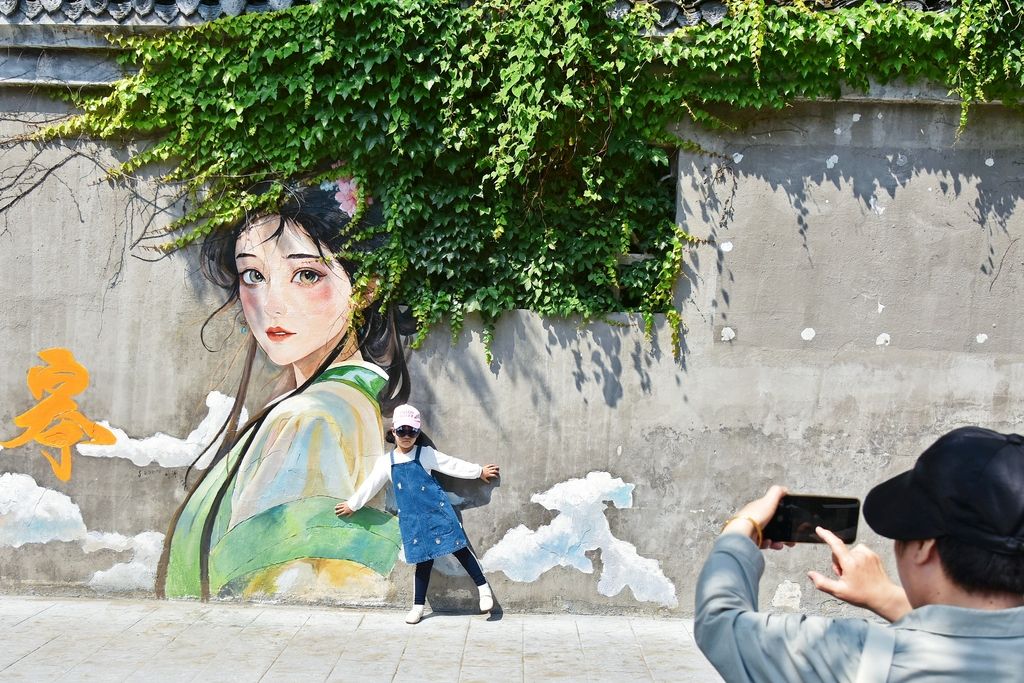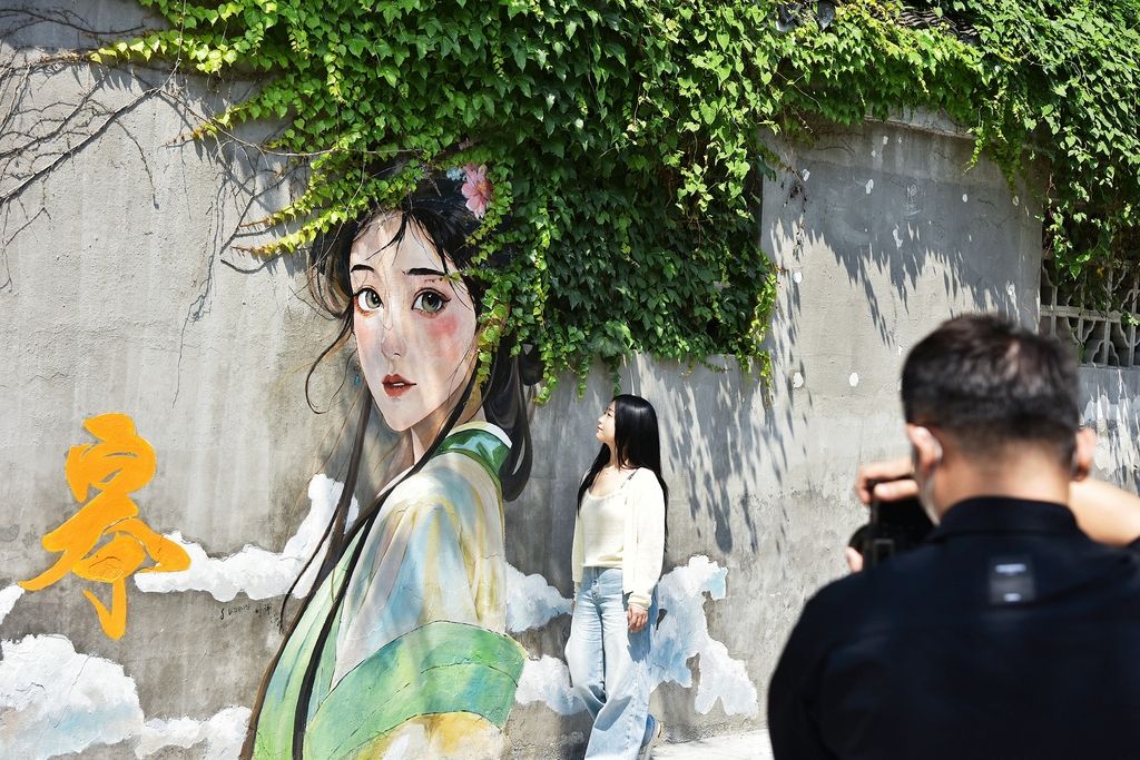 2025年5月24日,江苏南通,在江苏省如皋高等师范学校东侧的围墙上,一位回眸微笑的古风少女与头顶上的围墙“爬山虎”叶片巧妙融合成一幅充满浪漫诗意的墙绘画,成为城市街头又一处新晋网红打卡点。