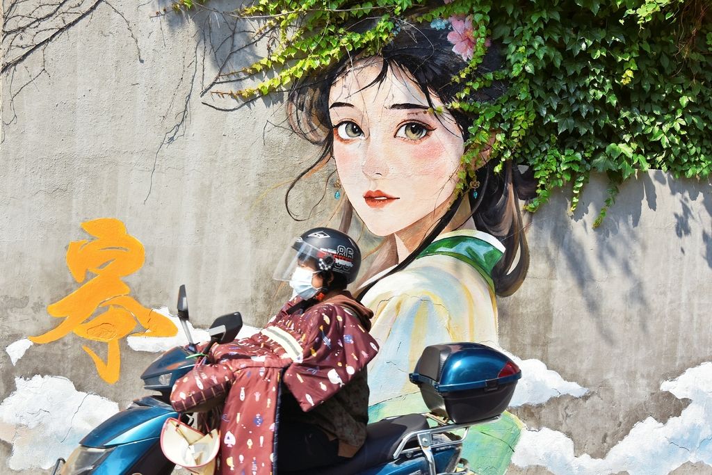 江苏南通:校园围墙现创意墙绘 古风少女与爬山虎相互映衬