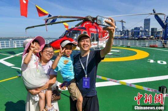 民众在“雪龙2”号极地科学考察破冰船飞行平台自拍合影。