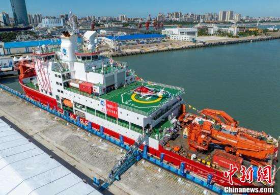 6月2日,完成中国第41次南极考察任务的“雪龙2”号极地科学考察破冰船,停靠在海南省海口市秀英港码头,开启为期5天的公众开放日活动。公众可近距离参观实验室、驾驶室以及飞行平台等多个特色区域。“雪龙2”号是中国首艘自主建造的极地科学考察破冰船。图为“雪龙2”号极地科学考察破冰船停靠在海口秀英港码头。(无人机照片)
