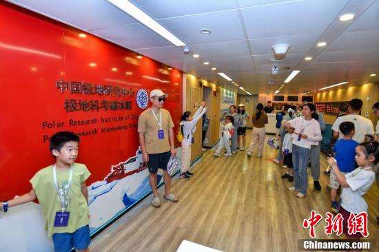 民众在“雪龙2”号极地科学考察破冰船登船大厅打卡拍照。