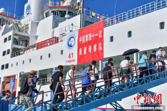 民众与“雪龙2”号极地科学考察破冰船合影。