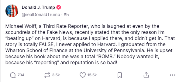 特朗普2日在社交媒体上发文说,有记者称他“死磕”哈佛大学只是因为他当年申请入学被拒,此事纯属造谣,“我根本从未申请过哈佛!本人毕业于宾夕法尼亚大学沃顿商学院。”
