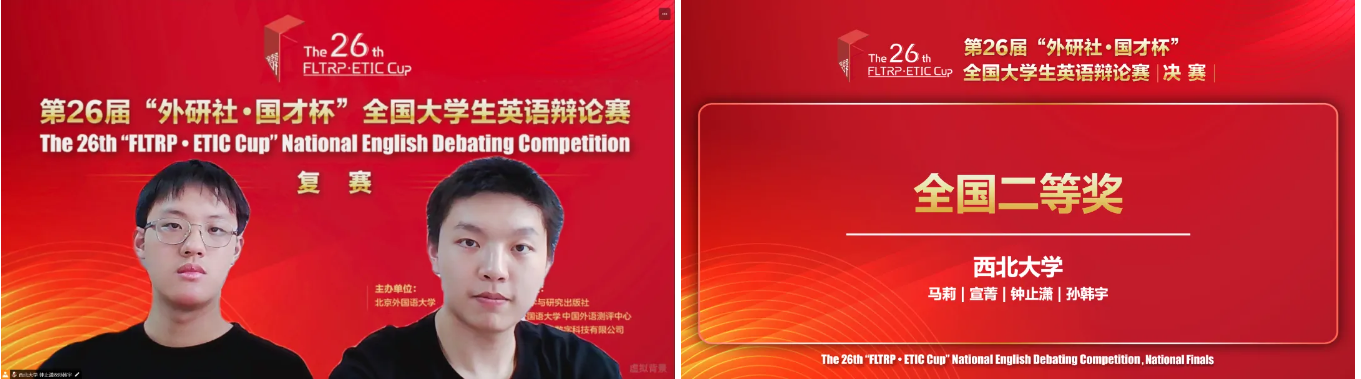 并肩作战至今,钟止潇、孙韩宇已共同斩获2024年“外研社·国才杯”全国大学生英语辩论赛决赛全国二等奖、2023年第五届“新东方·初音杯”西北大学英语辩论新手赛二等奖,还闯入了2024年“阿尔法杯”英语辩论新手赛半决赛。在正向能量的互相感染下,二人一同领略着英语辩论竞技的恒久魅力。