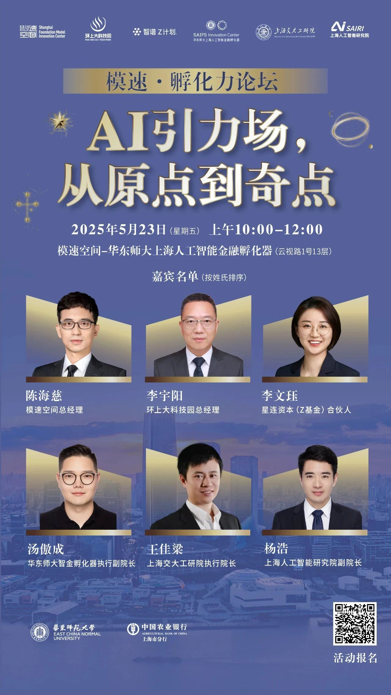 刚刚过去的五月,黄浦江畔迎来一场聚焦未来的思想盛宴——由华东师范大学上海人工智能金融产业研究院暨孵化器主办,模速空间、交大工研院、环上大科技园、上海人工智能研究院、智谱Z计划共同支持的“模速孵化力论坛”在模速空间举行。