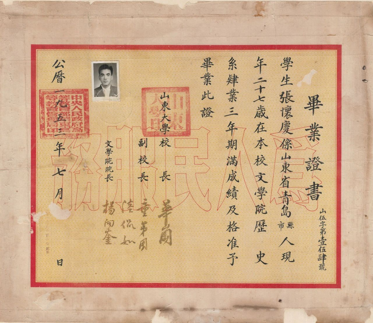 1950年,张怀庆考上当时齐鲁大学(齐鲁大学相关院系后并入山东大学)文学院的历史系,成为新中国成立后的首届大学生之一。