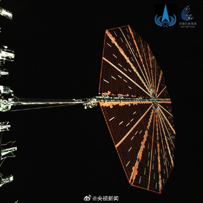 截至6月6日上午,天问二号探测器已在轨运行超8天,与地球距离超300万千米,工况良好。国家航天局发布了天问二号探测器传回的圆形太阳翼展开的图片。为满足在主带彗星开展探测的供电需求,天问二号探测器研发配置了圆形柔性太阳翼,展开就像一把中国团扇↓↓↓天问二号主要任务目标是对小行星2016HO3进行探测、取样并返回地球,此后再对主带彗星311P开展科学探测。(总台央视记者崔霞 李宁 陶嘉树)