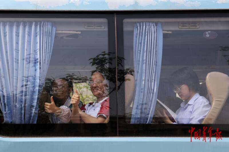 6月7日早上,山东威海,荣成三中,高考生透过大巴车窗户与送考老师互比大拇指。中青报·中青网记者 曲俊燕/摄