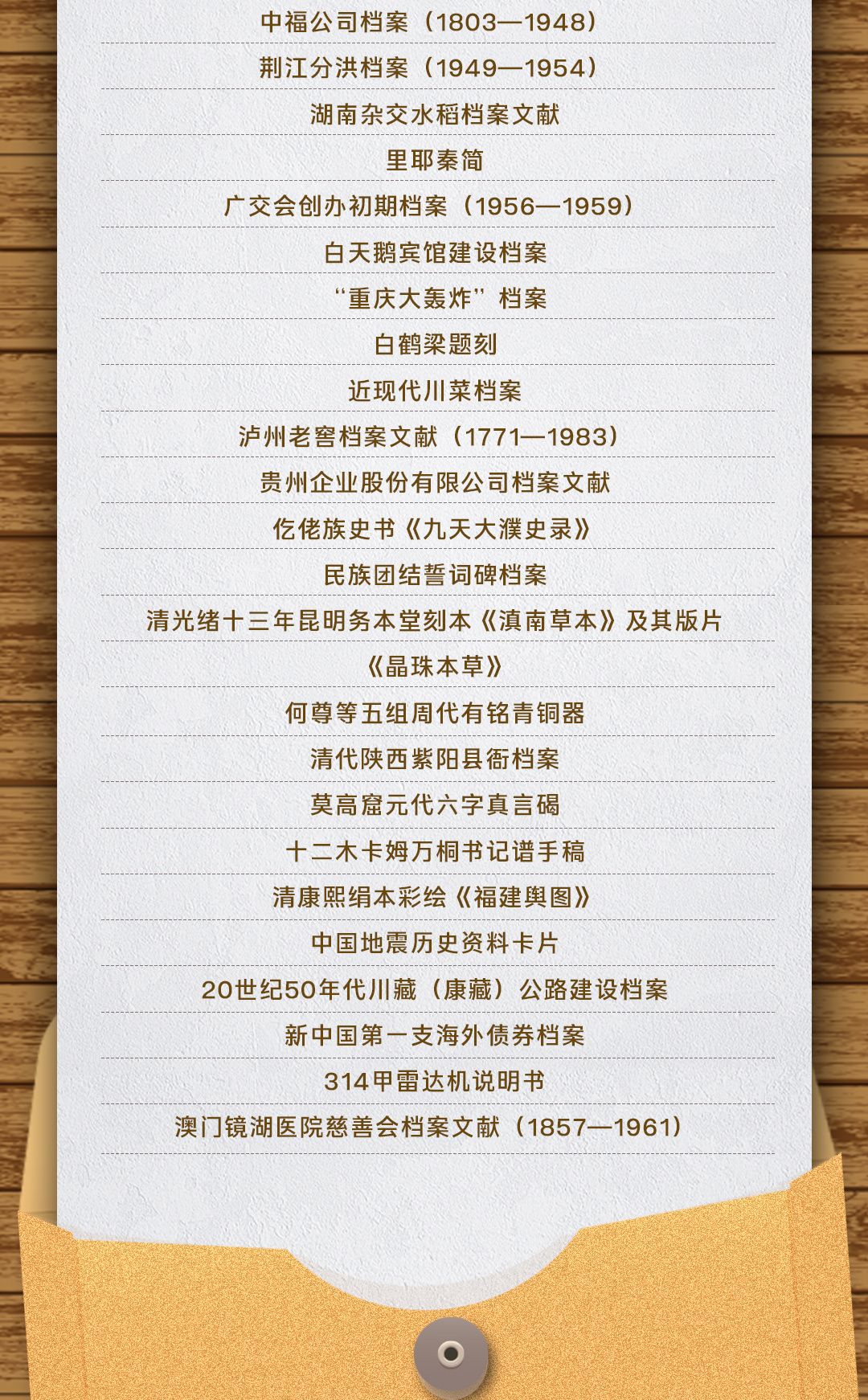 今天(6月9日)是国际档案日。档案,见证着历史,传承着文化。国家档案局公布第六批《中国档案文献遗产名录》,其中包括《百团大战档案》《“重庆大轰炸”档案》《红旗渠水利工程档案》《何尊等五组周代有铭青铜器》《银雀山汉墓竹简》《广交会创办初期档案(1956—1959)》《民族团结誓词碑档案》等52个项目。