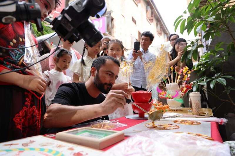 文创市集区内,糖画制作区域热闹非凡。糖画艺人现场挥毫,以糖为墨、勺为笔,快速勾勒出精致图案,尤以川剧脸谱元素最为吸睛。中外青少年在艺人指导下,亲手绘制川剧脸谱糖画,将传统川剧文化与民间技艺巧妙融合,创造出独一无二的艺术佳作。市集摊位上,各类川剧周边琳琅满目,既拓展了川剧文化的传播渠道,也为川剧文化产业化发展探索了新路径。