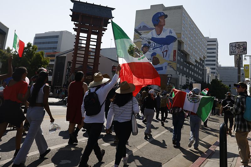 当地时间2025年6月10日,美国加利福尼亚州洛杉矶,抗议者在市中心游行。