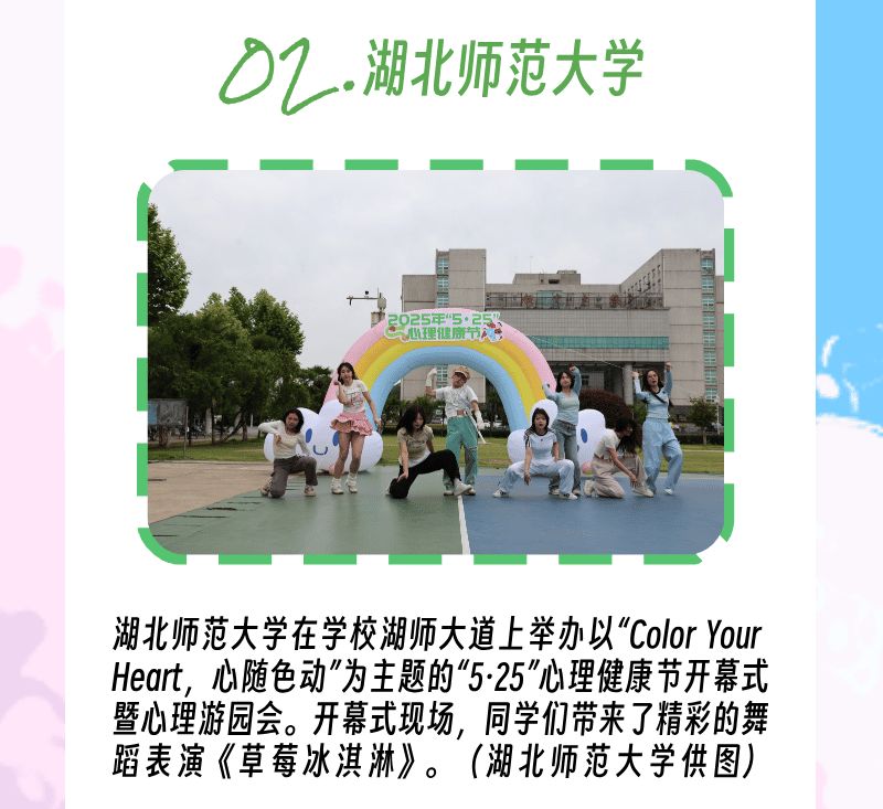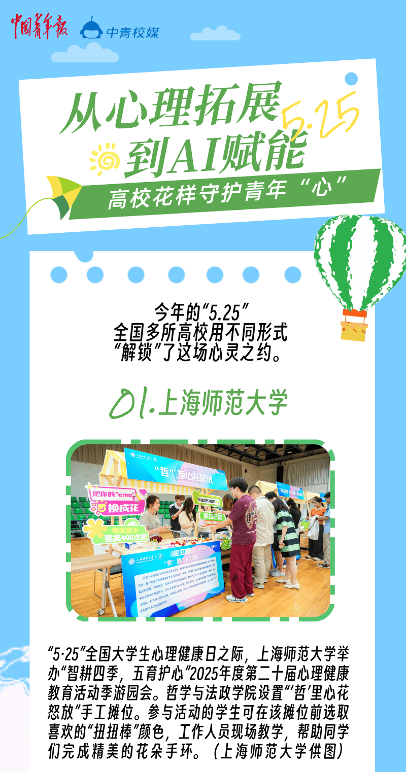 中国青年报客户端讯(中青报·中青网记者 刘俞希 程思)近日,全国各高校围绕“5·25全国大、中学生(包括中职学生)心理健康日”开展了丰富多彩的心理健康主题月、主题周等活动。“5·25”谐音为“我爱我”,提醒青年学子珍惜生命,关爱自己。每年此时,全国各高校都会用不同形式“解锁”这场心灵之约。