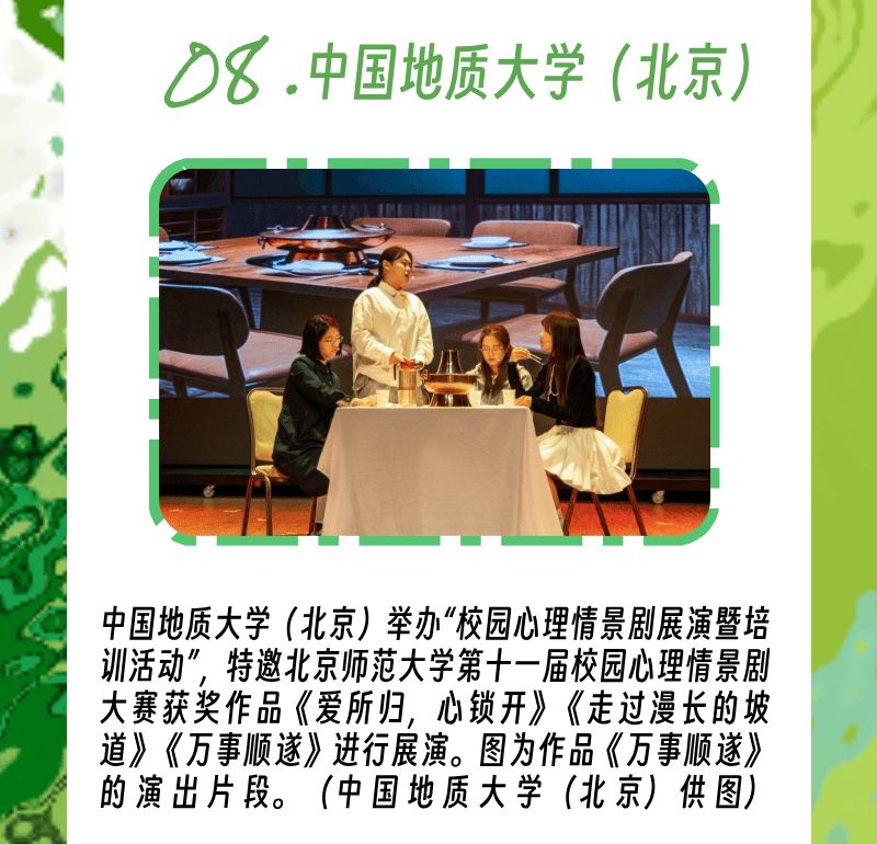以戏剧为媒,中国地质大学(北京)特邀北京师范大学第十一届校园心理情景剧大赛获奖作品来校展演,用贴近生活的故事传递心灵共鸣,引导学生探索心灵世界,汲取成长力量。剧目《万事顺遂》聚焦大学生对“幸福本质”的思考,通过主人公孙岁面临“完美人生体验卡”的抉择,让学生们感受到每一次挫折都能带来成长,用心体验真实的人生,感受幸福的积累。