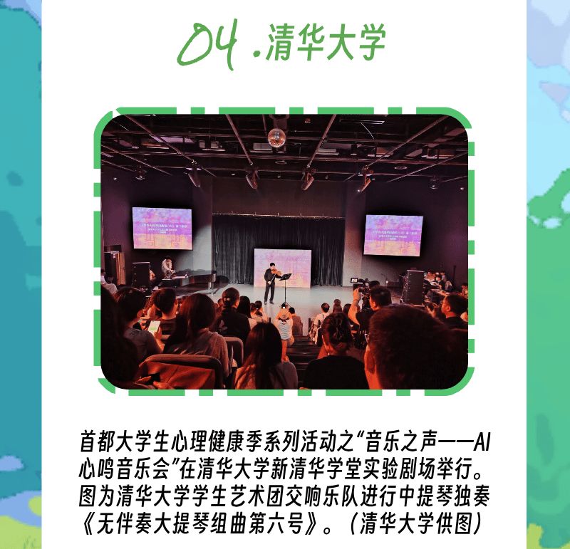 用AI赋能心理健康教育,清华大学举办“音乐之声——AI心鸣音乐会”,多所高校学生与AI同台演绎,带来一场科技与艺术跨界融合的心灵盛宴。这也是首都大学生心理健康季系列活动之一,自启动以来,先后收到了来自北京市39所大专院校的74首AI音乐作品。大学生通过使用AI技术将人文关怀融入音乐艺术,投射出当代青年的自我成长与心理探索。