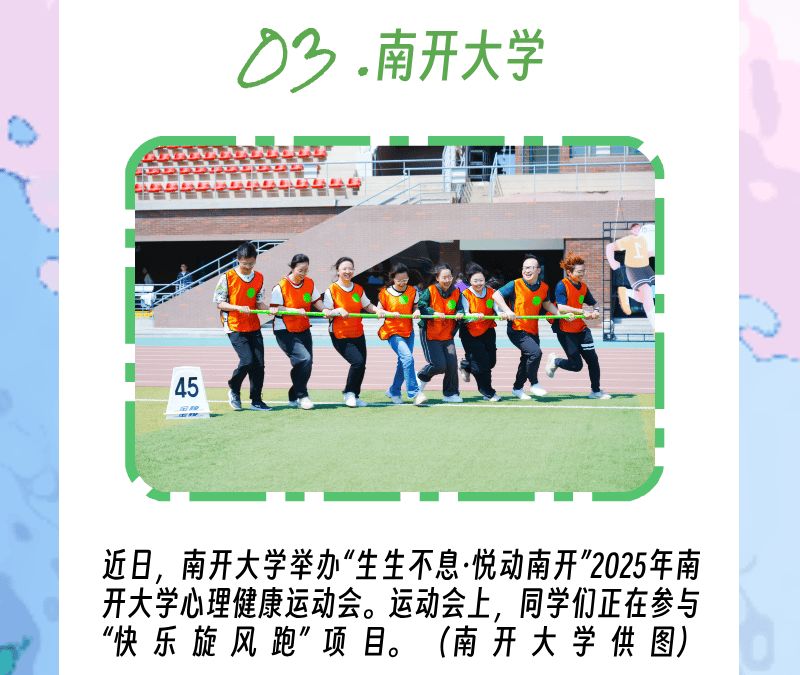 心理游园会、心理健康运动会、21天积极生命觉察体验、生命疗愈工作坊......南开大学以“生生不息”为主题,聚焦大学生生命教育与心理健康,在一个多月的时间内举办了11项可感知、可参与、可传播的沉浸式活动体验,涵盖工作坊、艺术创作、线上互动等多种形式,为构建温暖互助、阳光成长的校园心理文化生态注入活力。