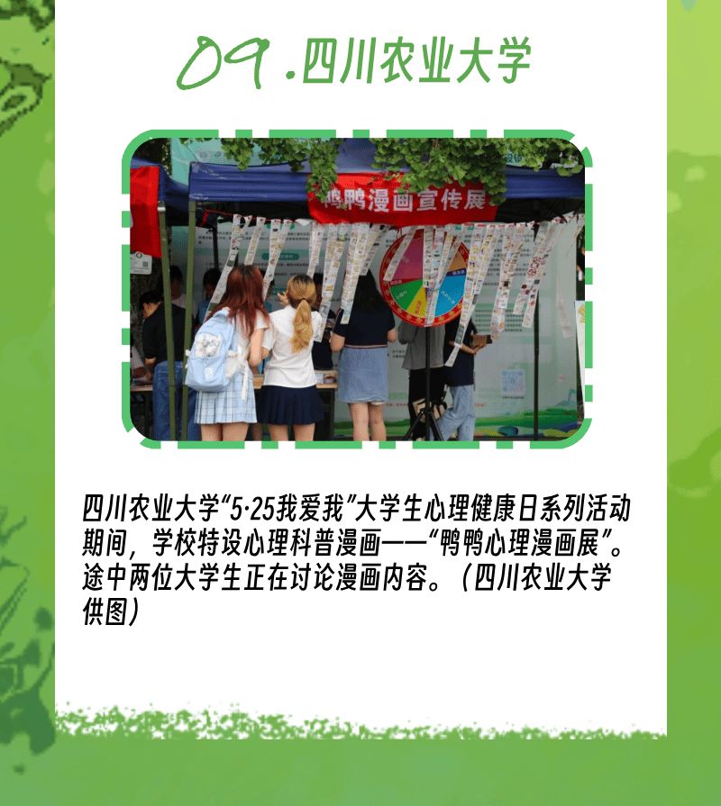 以画为媒,四川农业大学以30幅原创漫画生动呈现大学生常见心理议题,扫码互动超过2000人次,用轻松有趣的方式化解了学生对心理话题的紧张感。此外,活动还设置了“自然疗愈”展示和“我爱我,爱本我”心理测评,通过多元化、趣味性的互动体验,构建了全方位的心理健康教育体系,为8000余人次学生提供了别开生面的心理成长体验。