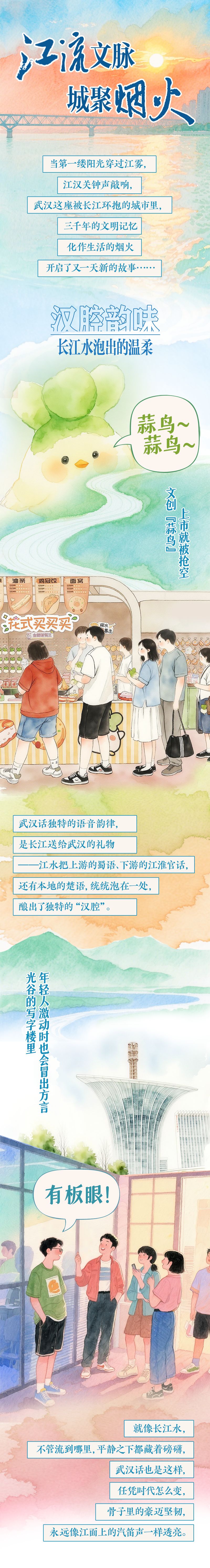 当第一缕阳光穿过江雾,江汉关钟声敲响,早点摊炊烟袅袅,长江轮渡的汽笛声、汉剧票友的悠长唱腔与博物馆沉睡千年的文物一起,开启武汉这座被长江环抱城市的新一天……三千年的文明记忆从未远去,它们化作生活的烟火,流淌在武汉人的一日三餐、一言一行中。