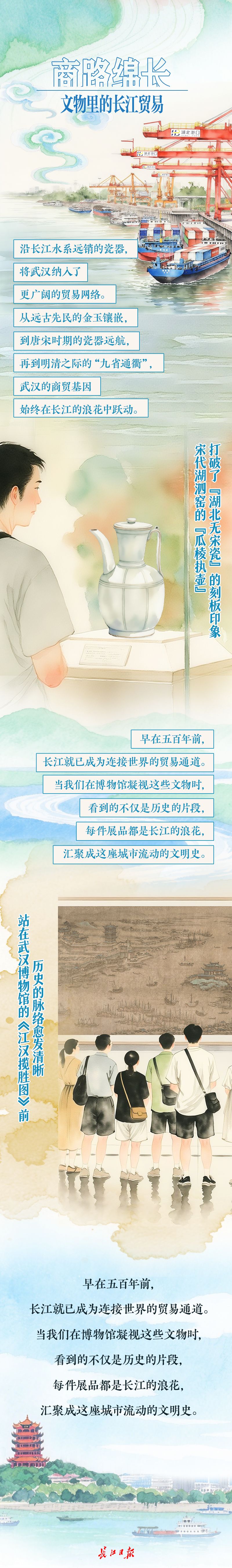 1898年,张之洞在奏折中正式将汉口镇冠以“九省通衢”之名,但武汉作为贸易枢纽的故事,早在商周时期就已开始书写。站在武汉博物馆的《江汉揽胜图》前,历史的脉络愈发清晰。江上千帆竞发,岸上屋舍鳞次栉比,城墙逶迤如龙,它们共同诉说着一个事实:早在五百年前,长江就已成为连接世界的贸易通道。今天,当我们在博物馆凝视这些文物时,看到的不仅是历史的片段,每件展品都是长江的浪花,汇聚成这座城市流动的文明史。