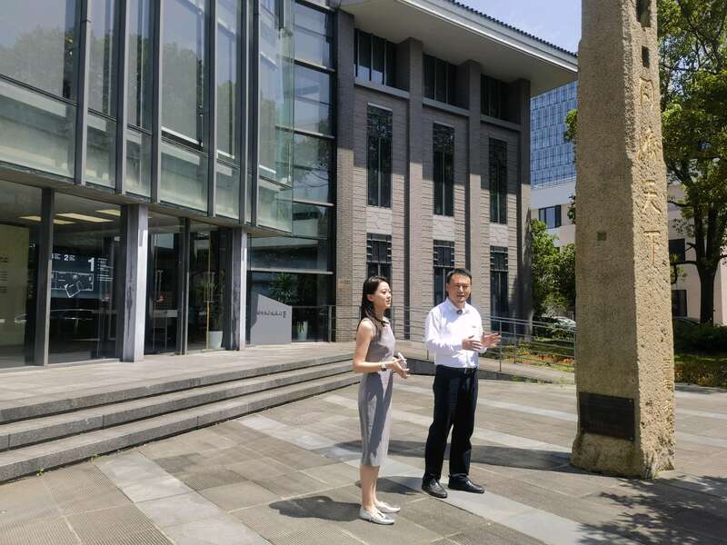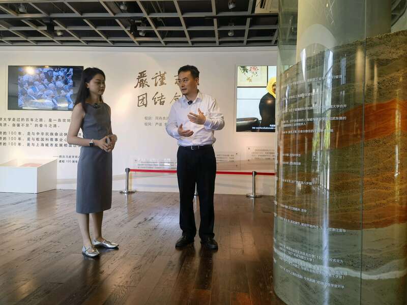 同济大学档案馆馆长(右一)介绍校史馆总体情况。中青报•中青网记者 蔡华丽/摄