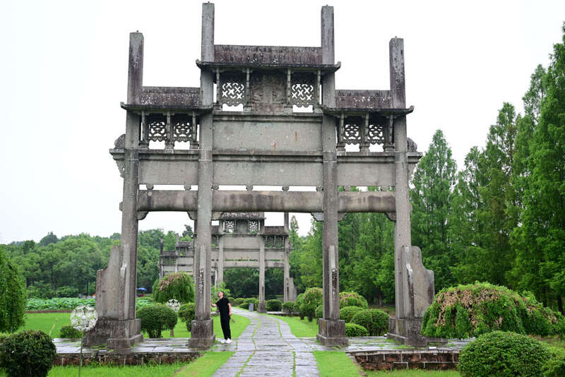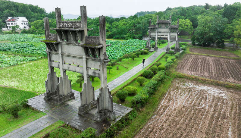 6月19日,周虎在位于歙县的全国重点文物保护单位棠樾牌坊群巡查。