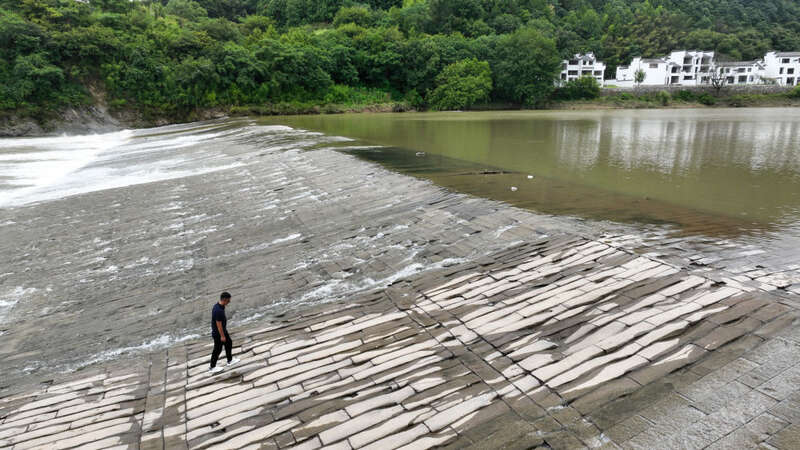 6月20日,周虎在位于歙县的全国重点文物保护单位渔梁坝巡查。