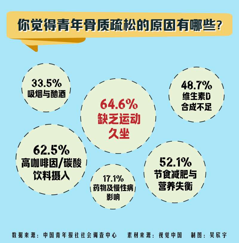 你觉得现在青年骨质疏松的原因有哪些?数据显示,缺乏运动、久坐(64.6%)、高咖啡因/碳酸饮料摄入(62.5%)、节食减肥与营养失衡(52.1%)是受访青年认为导致青年骨质疏松的常见原因。另外还有:维生素D合成不足(48.7%)、吸烟与酗酒(33.5%)、药物及慢性病影响(17.1%)等。