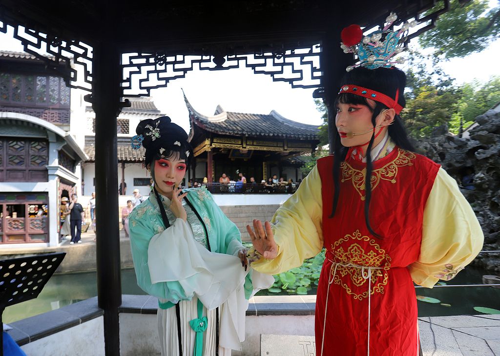 2025年7月15日,演员在苏州狮子林表演传统昆曲《石头记》。当日,苏州古典园林狮子林推出昆曲等颇具吴文化特色的旅游项目,使游客在欣赏姑苏园林美景的同时,体验吴地浓郁的地方风情,颇受中外游客的青睐。