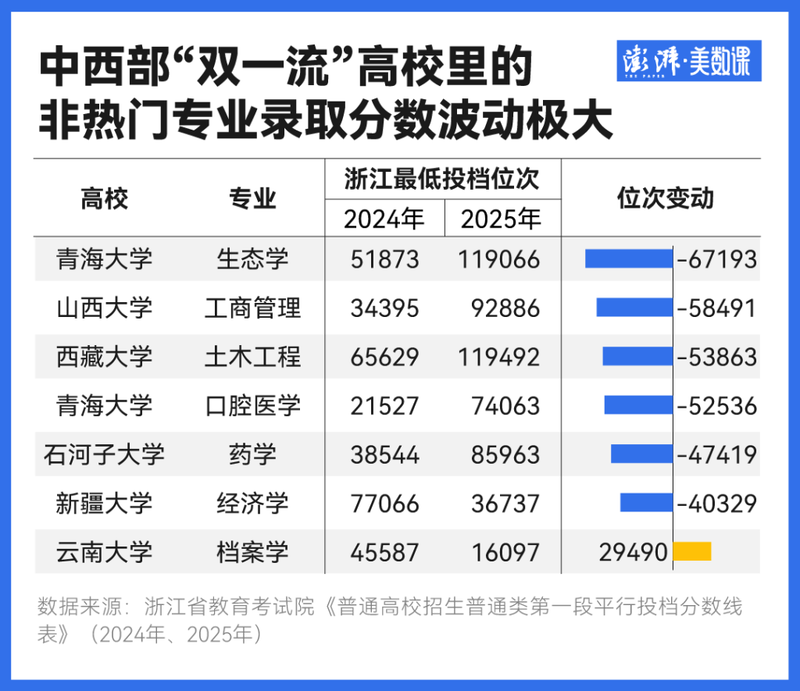 以浙江今年的投档线为例,“双一流”高校里波动幅度动辄5万名上下的,大多集中在青海大学、西藏大学等中西部高校,而专业也主要是生态学、工商管理这些冷门或就业前景较差的专业。