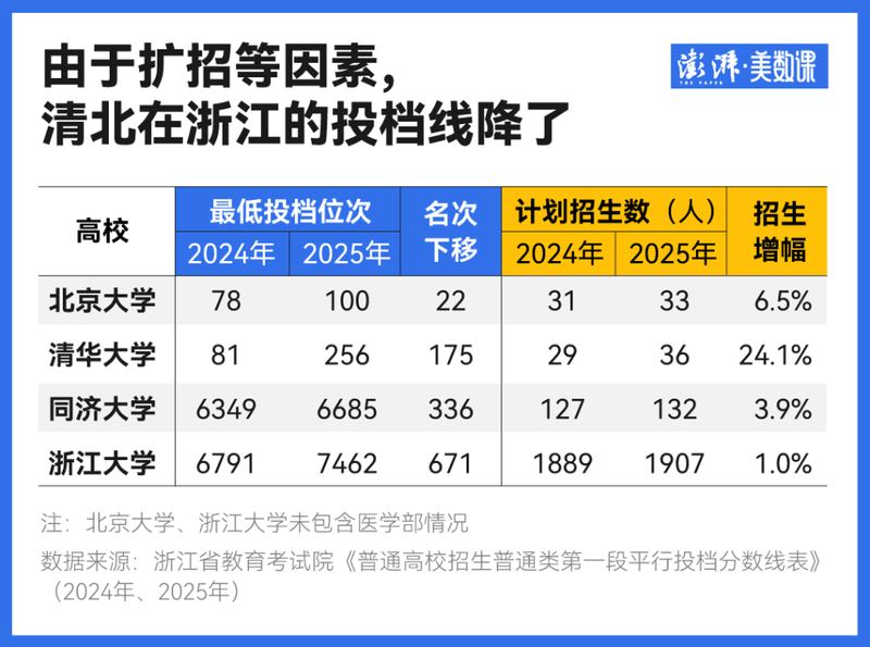 除清华外,北大、同济、浙大等在浙江扩招的高校,其投档线也有不同程度的下移,今年在浙江的投档线也有不同程度的下移。只是不同高校在各省份的名额分配有所差异。例如同样今年本科扩招150人的清北,前者在浙江扩招了7人,后者在浙江扩招了2人。