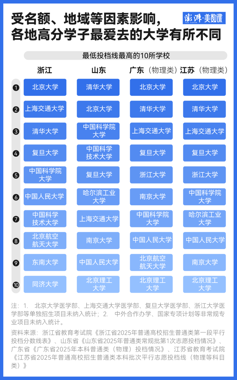 不过,根据澎湃美数课的梳理,除了浙江是上海交大反超清华,在已公布各高校具体投档线的省份中,清北依然牢牢占据TOP2。