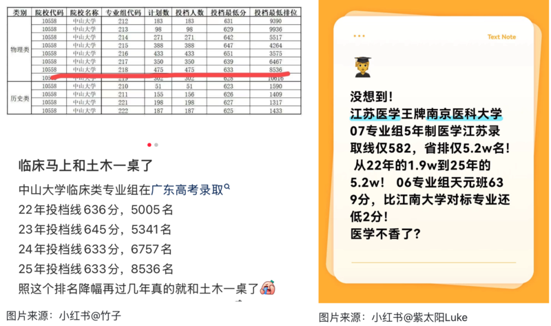 相似的情况还出现在山东、广东等省份。例如首都医科大学的临床医学(5+3一体化)去年在山东的投档位次是1788名,今年则下滑了近千位,到了2647名;中南大学湘雅医学院的临床医学八年制,今年在广东的投档位次是1809名,2024年则是1177名。