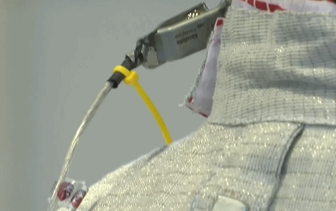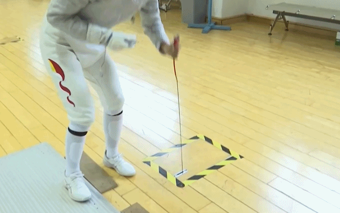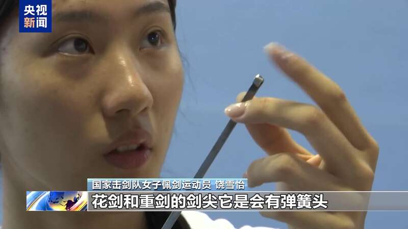 总台央视记者 杜思源:我手上的花剑有一根红色的长线,它其实是埋在剑里面的一根电线。当完成一次击中的时候,剑头的位置500克左右的压力向下,与对方的金属衣相连接,这个电路就会完成一次闭合。