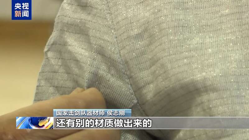 国家击剑队器材师 侯志刚:灯亮了只是告诉被击中了,裁判再根据规则要求,谁是优先权来得分,那是裁判来判决的。佩剑运动员规则规定腰部以上都是有效部位,包括手套、护袖那一块也是带金属面料,也是属于导电的。金属丝有好几种,有用不锈钢丝的,也有用镍的,还有别的材质做出来的。织成布,最大电阻不能超过5个欧。如果金属衣上比赛的时候有斑点,就是绿色的生锈汗碱,在国际比赛上只要发绿就不让比赛了。
