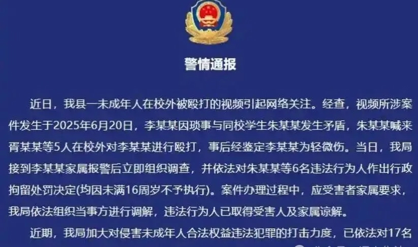 7月22日,江西万载县公安局发布《警情通报》,该案件发生于2025年6月20日,因琐事与同校学生发生矛盾,朱某某喊来5人在校外对李某某进行殴打。事后经鉴定李某某为轻微伤。警方对朱某某等6名违法行为人作出行政拘留处罚决定,均因未满16周岁不予执行。