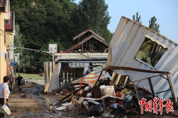 家住太师屯镇葡萄园横街平房的刘女士告诉中青报·中青网记者,随着洪水水位升高,逐渐没过胸口,屋内外的水死死顶住了大门。她穿着家里备好的救生衣,等待救援车辆破开家门后,才游到岸边脱困。附近的住户吕先生指着一辆满是淤泥的白色轿车说,他的车原本停在篮球场,洪水将车冲到了三五百米外的小路上。