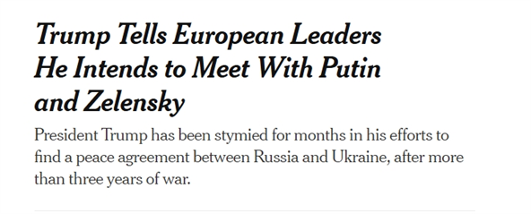 据《纽约时报》报道,特朗普6日电话告知欧洲领导人,他计划先与普京会晤,之后与普京和泽连斯基举行三方会谈。会谈仅限美俄乌三国领导人参与,不会包括任何欧洲国家的代表。