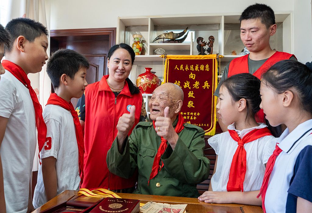 2025年8月14日,江苏省南通市通州区金沙街道联合通州小学开展“传承抗战精神 赓续红色血脉”主题教育活动,社区干部与小学生一起,探访99岁抗战老兵于健老人。通过聆听于健老人深情讲述战斗经历,引导小学生们学习抗战精神,传承红色基因,争当新时代好少年。