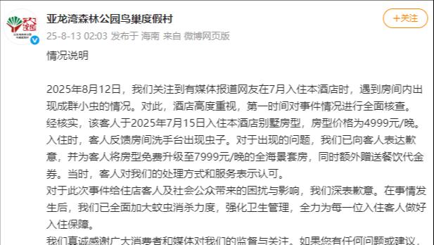 三亚7199元一晚的酒店虫子成群?涉事酒店致歉