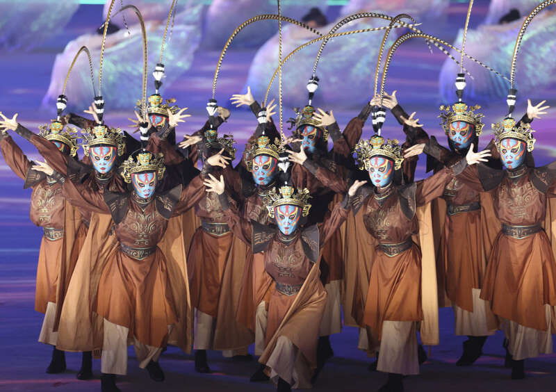 ↑8月8日,演员在成都世运会射准射箭复合弓混合团体决赛颁奖仪式前表演川剧。