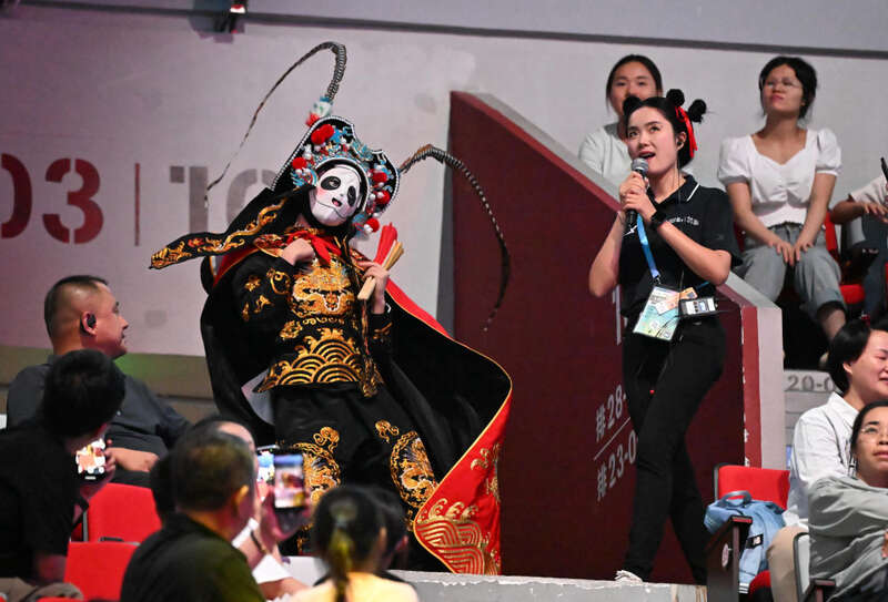 ↑8月10日,川剧变脸表演者在成都世运会技巧和蹦床比赛决赛前进行暖场表演。